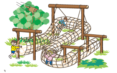 ロープやネットをのぼり丸太をわたる